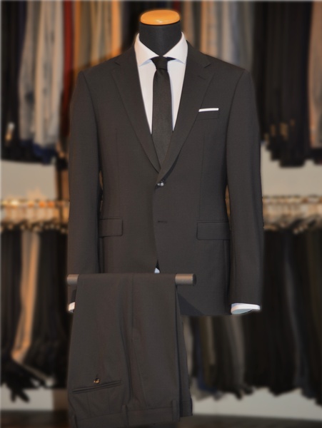 Der Anzug zeigt sich im klassischen Design und strahlt schlichte Eleganz aus. Das fallende Revers mit einem Zierknopfloch auf der linken Seite sowie leicht gepolsterten Schultern sind von sorgfältiger Verarbeitung.