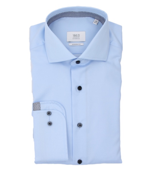 Das ETERNA Modern Fit Hemd mit einem Haifischkragen ist ebenfalls in einer leicht taillierten Passform erhältlich. Es ist aus einem atmungsaktiven Twill-Stoff gefertigt, der Feuchtigkeit absorbiert und die gefühlte Temperatur am Körper ausgleicht. Wie die anderen ETERNA Modern Fit Hemden ist auch dieses Hemd selbstglättend und stets bügelfrei. Es besteht aus 100% feinster Baumwolle, einer der feinsten und hochwertigsten Baumwollsorten weltweit. Das Hemd hat vierlochige Knöpfe und eine aufwendige Knopf-Vernähung für mehr Haltbarkeit und Sicherheit. Wenn das Hemd tropfnass aufgehängt wird, ist es nach dem Trocknen glatt und weich. ETERNA Hemden sind nach den strengen Anforderungen des Öko-Tex Standard 100+ schadstoffgeprüft, was garantiert, dass sie sicher für den Körper sind. ETERNA ist ein Unternehmen mit einer Tradition und Innovation, die bis ins Jahr 1863 zurückreicht.