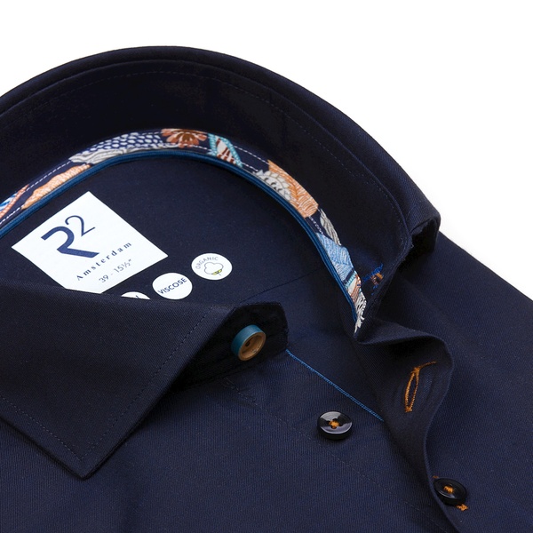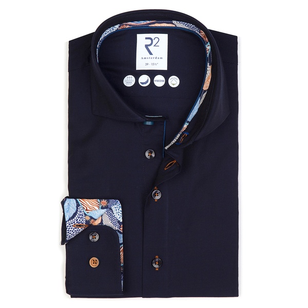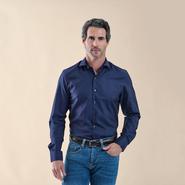 Dieses Hemd hat eine ansprechende blaue Farbe und besteht aus einer Mischung aus Baumwolle und Polyester. Der Stoff ist strapazierfähig und pflegeleicht. Das Hemd hat einen Widespread-Kragen, der modern und stilvoll ist. Es ist mit einem Druckmuster versehen, das dem Hemd einen interessanten Look verleiht. Die Manschetten sind einzeln und mit Knöpfen verschließbar. Das Hemd wird ebenfalls durch Knöpfe geschlossen und hat eine Langarm-Länge. Es verfügt nicht über eine Brusttasche und hat einen modernen, figurbetonten Schnitt.