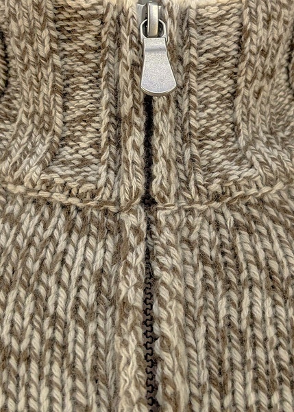 Diese zweifarbige Strickjacke aus 100% Schurwolle ist gestrickt und bietet angenehmen Tragekomfort. Sie verfügt über einen Stehkragen, Seitentaschen, einen zweiseitigen Reißverschluss sowie Bündchen an Ärmeln und Saum.