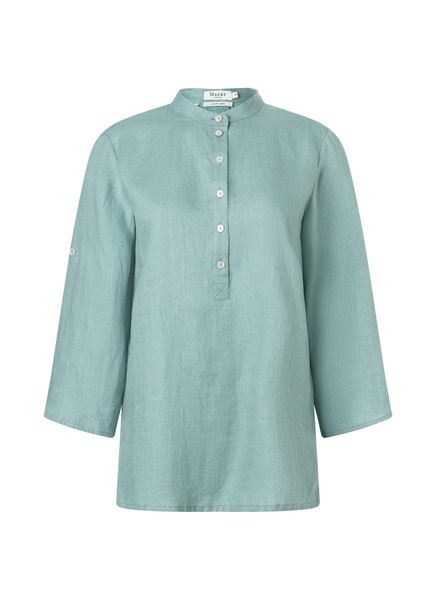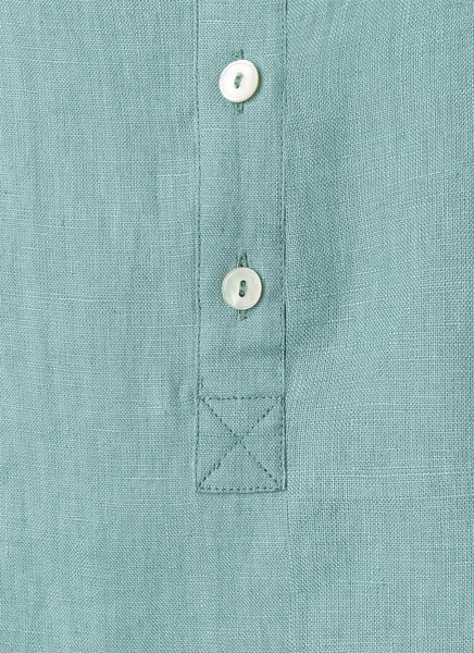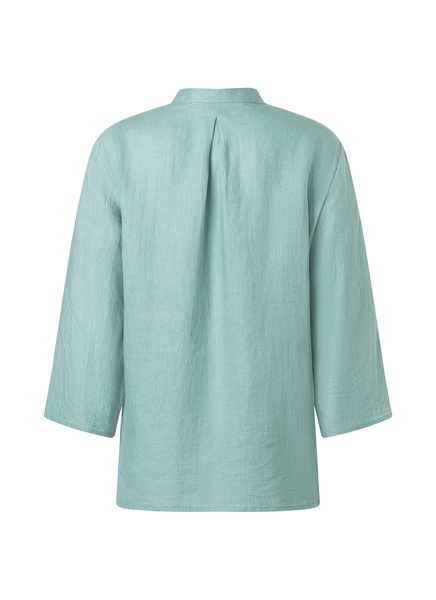 Türkise Tunika aus 100% Leinen mit rundem Ausschnitt zum Zuknöpfen. Die etwas weitere Passform verleiht ein leichtes und locker luftiges Tragegefühl ohne zu beengen. Besitzt aufgrund des Materials den typischen Leinen-Look mit Edelknitter und Struktur im Stoffgewebe.