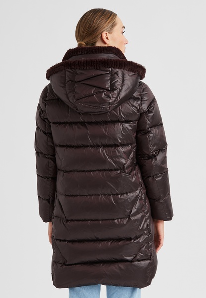 Für kuschelige Wärme sorgt der Streifen-Kunstpelz, der als Kragen- und Kapuzenfutter sowie als Besatz an der vorderen Kante und an den Ärmelsäumen eingesetzt ist.