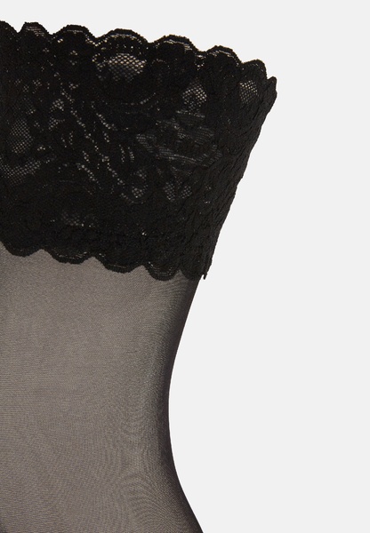 Ultra-feminin: Diese transparenten Stay-up setzen mit schimmernder Brillanz das Bein vorteilhaft in Szene und enden in einem dekorativen, breiten Spitzenband mit floralem Muster und Wolford-Logo. - Kaum sichtbare Spitzenverstärkung - Weiblicher Akzent unter Kleidern und Röcken