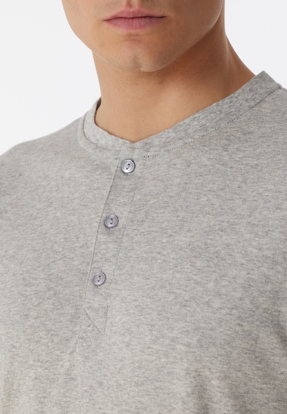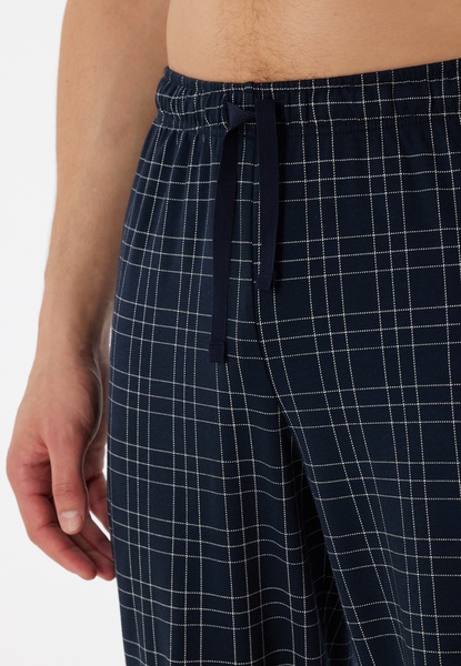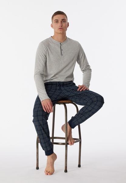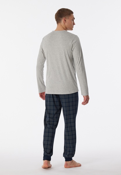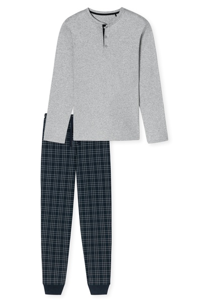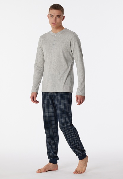 Der lange Herren-Schlafanzug aus der SCHIESSER-Serie „Fine Interlock“ besteht aus einem grau-melierten Oberteil und einer karierten Hose in Grau-Melange und Nachtblau. Das Oberteil ist ein unifarbenes Langarmshirt mit Serafino-Kragen und funktionaler Knopfleiste. Die Hose verfügt über einen bequemen Bund mit tonaler Bindekordel und unifarbene Bündchen an den Beinabschlüssen. Der Schlafanzug ist aus hochwertiger, angenehm weicher Interlock-Qualität gefertigt und besteht zu 100 % aus Baumwolle.