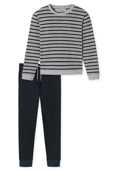Dieses Modell besteht aus einem gestreiften Oberteil und einer einfarbigen Hose. Es überzeugt durch sein schlichtes, aber stilvolles und zeitloses Design, das zu jedermann passt. Das Langarmshirt besitzt einen gerippten Rundhalsausschnitt und ebenfalls gerippte Bündchen an den Ärmeln, die für eine angenehme Passform sorgen. An der Hose befinden sich ein bequemer Bund mit Bindekordel, sowie zwei offene Seitentaschen. Die Material-Zusammensetzung aus Baumwolle und Polyester macht den Schlafanzug hautfreundlich, atmungsaktiv und strapazierfähig.