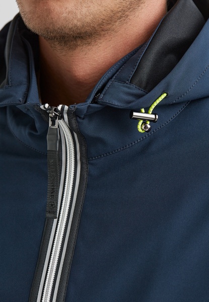 Diese Active-Performance-Jacke überzeugt durch ihre technische Ausstattung, modernes Design und hohen Tragekomfort. Der funktionelle 3-lagige Oberstoff mit Membran und Elasthan-Anteil ist atmungsaktiv sowie wind- und wasserdicht und hält mit einer Wassersäule von 20.000 mm auch widrigen Wetterbedingungen zuverlässig stand.